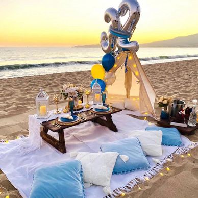 Experience the timeless charm of the Florida Bay with our Classic Beach Picnic. Thoughtfully curated to highlight the natural beauty of the beach, this setup features cozy blankets, plush pillows, and a tastefully styled low table—perfect for an intimate date, a relaxing solo moment, or a laid-back gathering with friends. Enjoy a Beautiful Sunset with soft lighting and gentle ocean breezes that completes the scene, offering a simple yet elegant escape to Florida's Top Rated Beaches